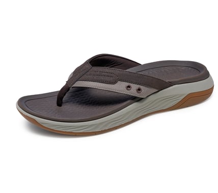 Bring on the sand, surf, and sun in Skechers Relaxed Fit®: Silva - Falco. This roomy 3-point thong slippers features a smooth vegan leather and mesh upper with eyelet detail and a contoured Luxe Foam® footbed.