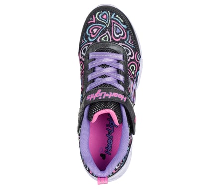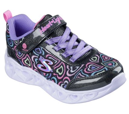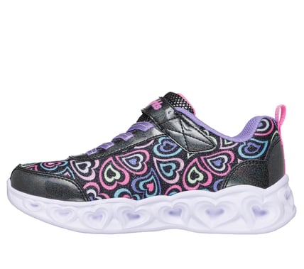 Delight them with the twinkling fun of Skechers Heart Lights - Boogie Love. This colorful sneaker features a sparkly, heart-printed synthetic upper with fixed stretch laces and Adaptive Closure, plus a heart-sculpted light-up midsole.