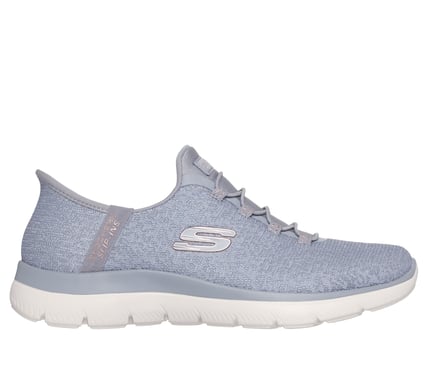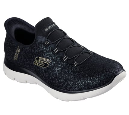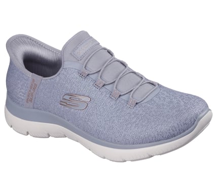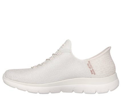 Add some shimmer to every step wearing Skechers Slip-ins®: Summits - Lunar Glow. Designed with our Heel Pillow®, this vegan slip-on features an iridescent mesh upper with fixed stretch laces and a cushioned Skechers Air-Cooled Memory Foam® comfort insole.