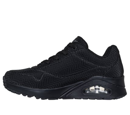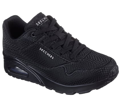 Turn heads with a bold and bright statement wearing the Street UNO Shiny Scale black lace up sneaker from Skechers. This lace-up fashion style features a durabuck upper with a reflective snake print, a cushioned Skechers Air-Cooled Memory Foam insole, and a visible Skech-Air airbag midsole.