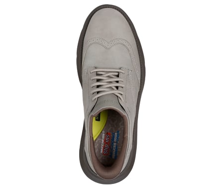 Office looks and effortless comfort combine in Skechers Hands Free Slip-ins®: Garza - Sully. Designed with our exclusive Heel Pillow™, this Classic Fit™ wingtip style features a leather upper with stretch laces and a charcoal-infused Skechers Air-Cooled Memory Foam® insole.